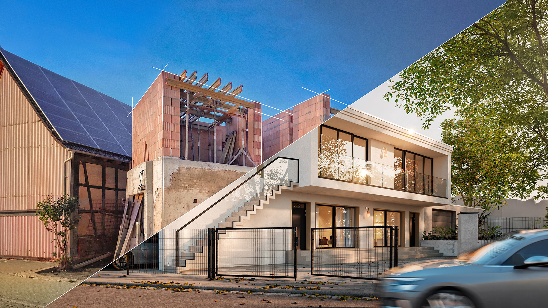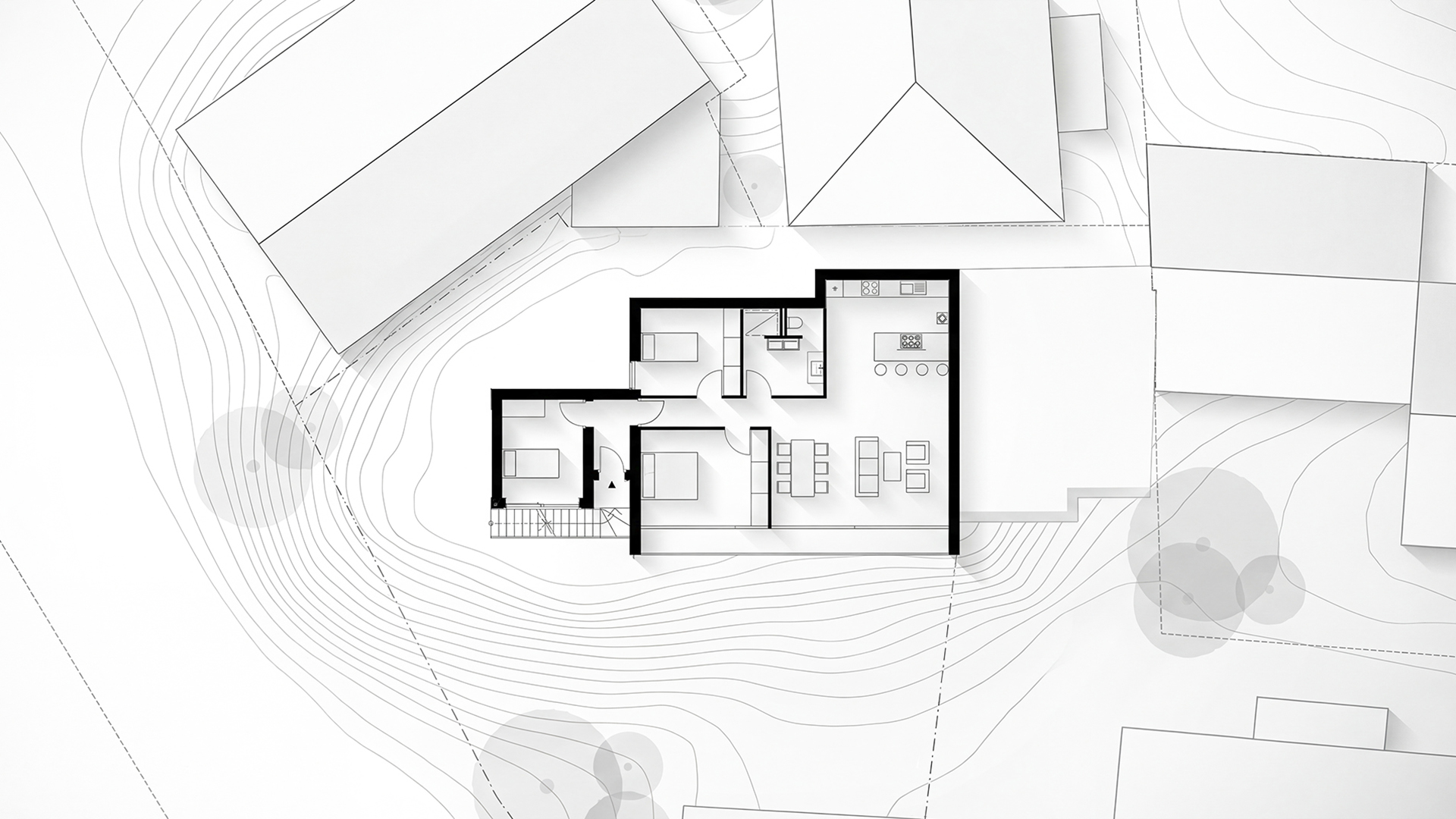 Der massive Abstellraum bildete die bauliche Grundlage des Projektes. Durch Aufstockung und klare Kubatur entstand ein kompaktes Zweifamilienhaus. Großzügige Öffnungen stärken Licht, Transparenz und den Bezug zum Außenraum. Eine außenliegende Treppe organisiert die unabhängige Erschließung beider Wohneinheiten.